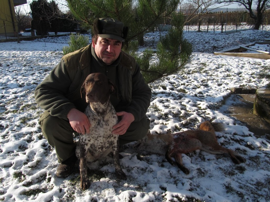 Вчерашний снежный налет и вечерняя температура ниже точки замерзания побудили меня и моего мужа отправиться на вечернюю заседку. В 8 часов вечером каждый из нас уже сидел на вышке и ждал, если покровители охотников осуществят наши мечты и подготовят для нас какой-то охотничьий случай. Несмотря на то, что я еще никогда не успела добыть лисицу и постоянно желаю себе быть успешной на охоте лисицы, вот тот вечер я больше желала успешную охоту моему мужу, так как я хорошо знала, что вечером тому назад на том же самом месте лисица вывела моего мужа из себя и ему не удалось ни выстрелить. Перед вышкой, на которой сидела я паслось пять косулей, я потихоньку следила за ними и стягивала шапку чтобы более закрыть мои уши, так как неприятный ветер становился более холодным. Около 10 часов вечером я задыхалась, когда услышала выстрел из недалекой вышки на которой охотился мой муж. В первой момент я сомневалась, что я также услышала мгновение, когда пуля попала в зверь. Звоню мужу и разузнаю, что стрелял в лису, но не видел ее отбегать. Такое предложение утверждает меня в том, что охота была успешной и мы найдём лису лежать на месте выстрела. Отправляюсь на место происшествия напротив мужу. Хотя, когда мы встретимся, нас ждёт неприятный сюрприз – лисица бесследно исчезла. Тот вечер мы нейдём ещё какие то следы, но ни одну каплю крови не заметим. Разочарованны из неуспешной охоты мы вернемся к машине... ••• Хотя муж не может доспать до утра, когда постоянно думает о вчерашней охоте. Утром берет с собой суку Бриту чтобы лучше им напасть на след лисицы. Морозное солнечное утро принесет свои плоды когда на снегу обнаружат лисячий волос. Брита без колебания нападает на десять часов старый след. Только пять метров перед границей леса появится кровянной след. Брита идёт по кровяному следу в лес и за короткое время лису найдёт и принесёт. Лиса и после ранения сердца отбегла семьдесять метров. Настоящим я бы хотела поздравить моего мужа С полём! и очень поблагодарить нашей умнице Брите из Голштынов за отличный поиск лисицы! Даже дома мы не могли лишить нашу дочку Елишку о найдённой лисицу... как видно, Елишка надеемся вырастёт в большего кинолога и охотника! |